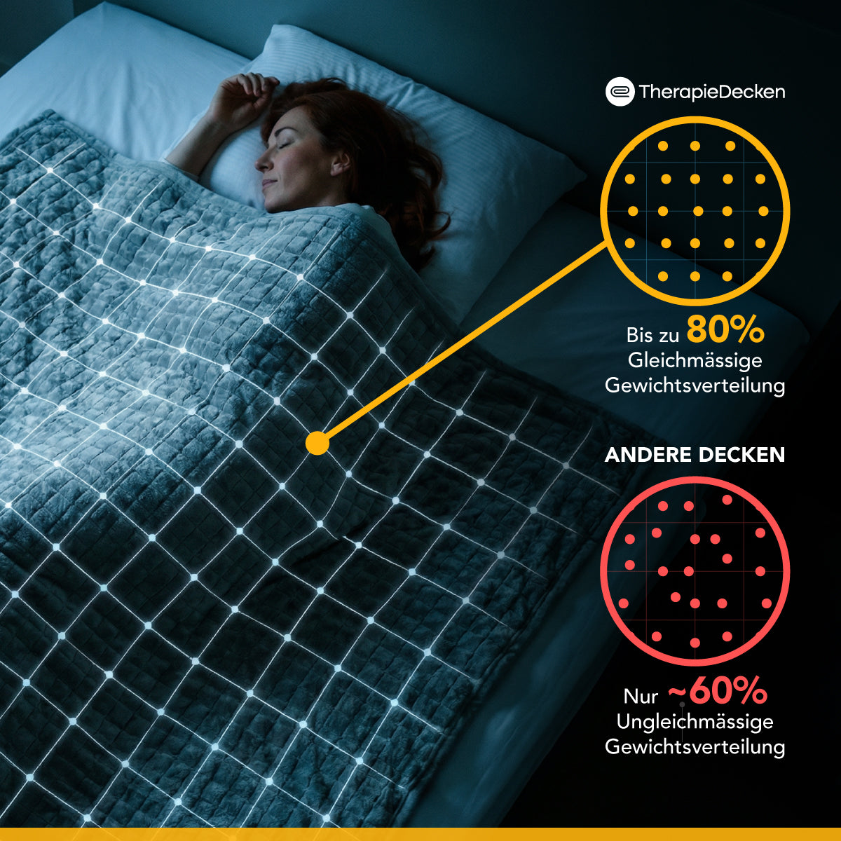 Die Therapiedecke (früher Gravity) ist die bekannteste Gewichtsdecke in Europa, da sie seit dem ersten Tag auf dem Markt ist. Bezug und Inlett der Therapiedecke werden entweder über Schlaufen oder per Reißverschluss miteinander verbunden. Durch die gleichmäßige Verteilung der Glasperlen in den Kammern ist die Decke besonders anschmiegsam.